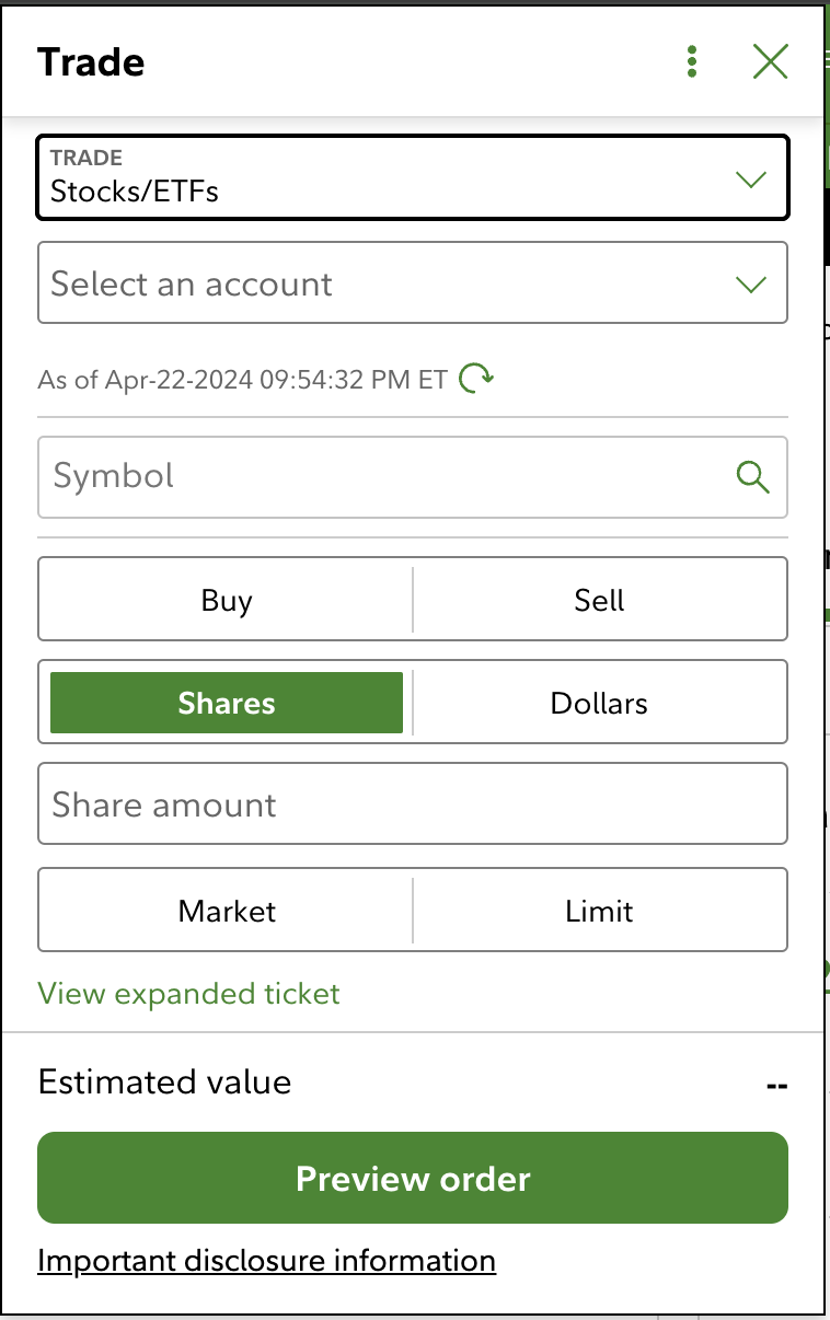 This is how it should look when you’re ready to buy. You have a trade type and account selected, you’ve entered the ticker symbol and dollar amount, you’ve chosen the “buy” option.